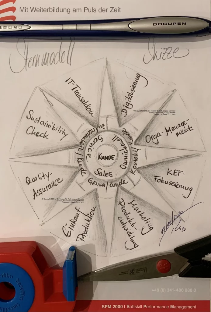 El boceto pretende mostrar lo que debería ser y siempre ha sido el centro de atención, el cliente. Pero el grado de sostenibilidad, salud, economía y aprecio de este sistema depende también en gran medida del marco organizativo en el que pueda desarrollarse.